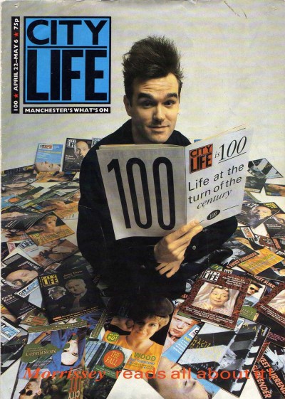 Front cover of the 100th issue of the listings magazine City Life. Note amongst the other cover stories pieces on the Hacienda, The Fall, New Order and others.