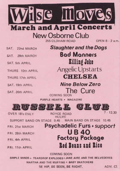 If this is the club I'm thinking of, it was one, if not THE roughest place I've ever been in my life-I'm sure walking through modern-day Kabul would have nowt on a night out at the "New" (WTF did they do to the "Old Osbourne) Osbourne club. It was located in a delapidated shack, nestling in the middle of a primeval council estate. On the night in question, the gig had been cancelled and a small group of us got holed up in the club with a gang of racist thugs-average age 9 years old trying to kick the doors in. It was broad daylight and we had to get a -the indignity of it-police escort back to Piccadilly away from the baying feral urchins. I was glad to get back to the Factory/Russel Club which seemed sedate by comparison.
