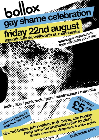 Bollox's gay shame event over the Pride weekend of 2008. Some village establishments refused to display the posters due to the term 'gay shame'. Oh dear.