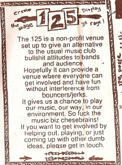 As I remember is was flat number 125 in the Hulme crescents (Royce?). By then mostly empty and being squatted. The internal walls were pulled out and the wiring tied up. There was a ladder that joined the stairs half way up the wall to get to the toilet! We saw NYC art noise Peel types, God is my co-pilot there and local band Lag.