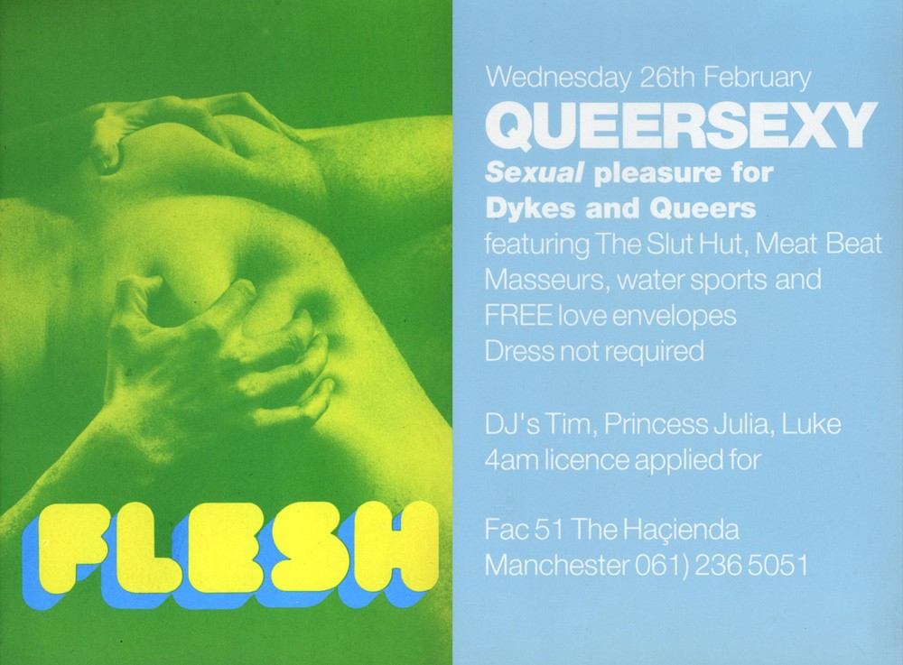 I think the 'love envelopes' mentioned on the rear of this flyer were packs of condoms, lube etc that we put together. Obviously HIV was a growing issue and we always made sure there was an agency at Flesh giving out plenty of condoms and organisations like Body Positive and Act-up were often there to talk to clubbers about HIV-related issues.