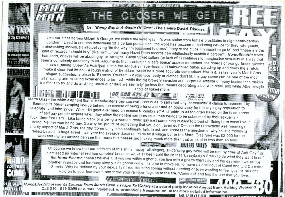 Homoelectric Chronicle #3 and Ryan is eloquently venting spleen for the rest of us. Many people felt disenfranchised by Canal Street and were incensed that the bars were using Mardi Gras to cash in, without donating any serious money to the HIV charities that it was supposed to be in aid of. It had become part of the corporate machinery that we were rejecting. At this stage in the proceedings, 'why be defined by your sexuality' indeed.