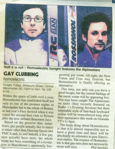 Kindly press article about Homoelectric and an appearance by 'The Alpinestars'.