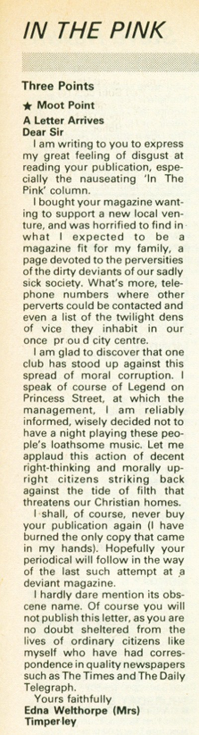 A mock gay-bashing letter published in City Life magazine from 1984. Edna Welthorpe was the Joe Orton-inspired pen name of a mysterious gay reader who would pop up from time to time to poke fun and keep everyone amused.