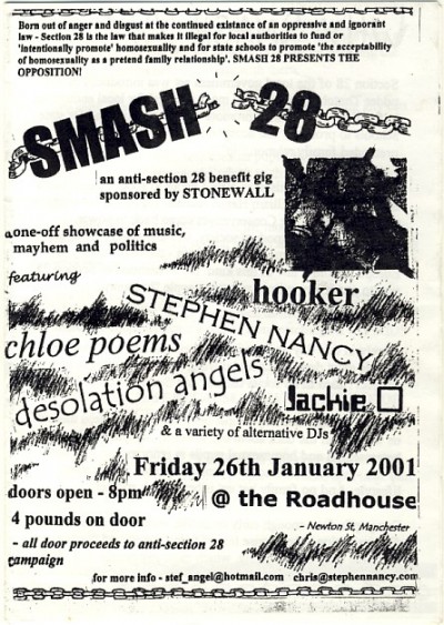 A fantastic night at The Roadhouse with some of Manchester's finest queer talent. The flyer for this Smash Clause 28 gig was produced in the style of a fanzine with a bit about each band playing.