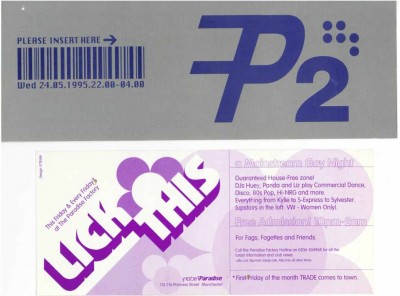 Paradise Factory second birthday plus 'Lick This' Friday night flyer. Don't remember too much about this birthday except we had some dubious 'futuristic' theme. 'Lick This' was a fairly lame effort to re-gain the mainstream as numbers had begun to drop off. Even at the time we hated 'guaranteed House-free zone'.