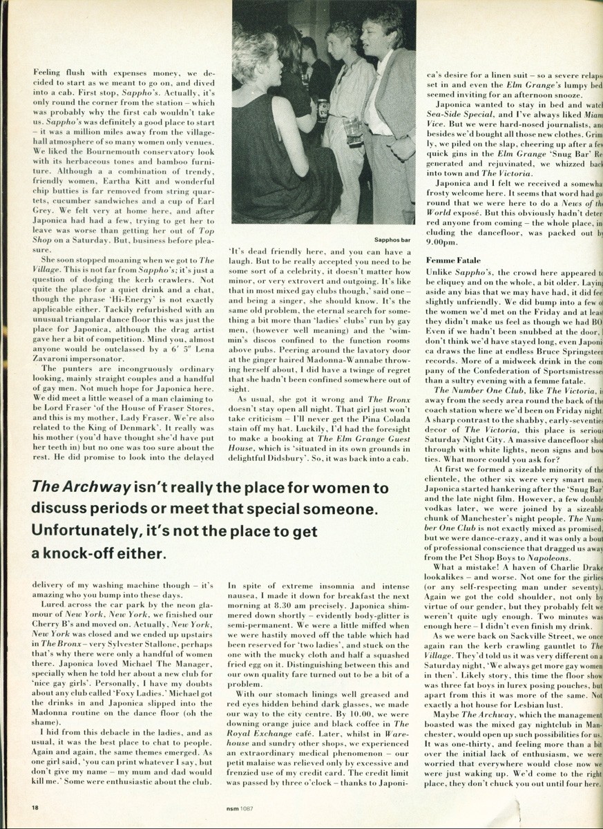 An article from NSM magazine, April 1987. Michelle Smith samples Manchester's lesbian and gay clubs "armed with Gay Life magazine, a bottle of poppers and something to speed us on our way."