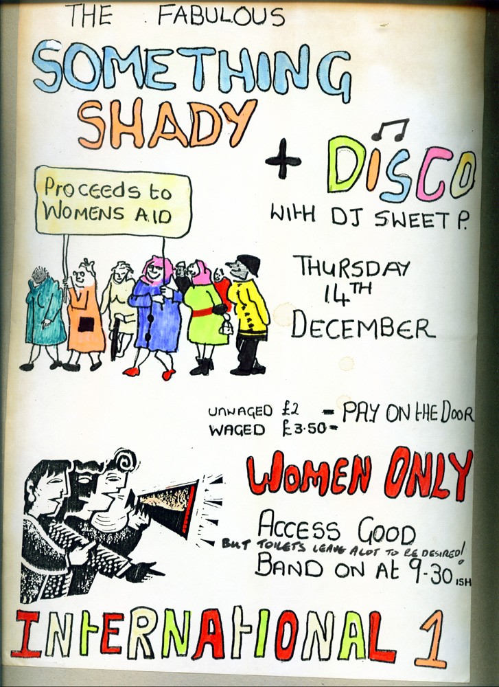 A poster for Something Shady's sell-out gig at the International 1. A lot of posters from this era would include a note about disabled access. Sometimes bands would be accompanied by a person interpreting the lyrics in sign language for deaf members of the audience. The was a general atmosphere supportiveness between members of minority communities.