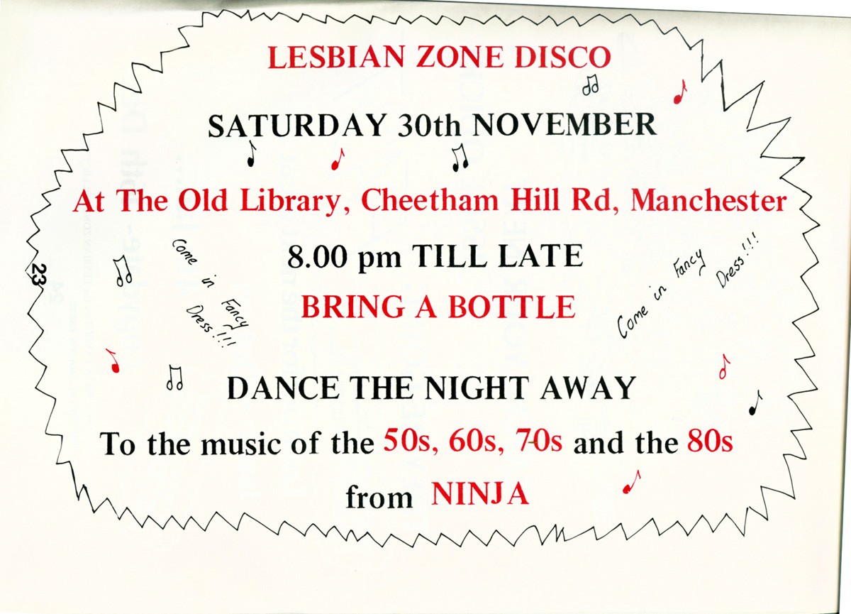A full page advert from Lesbian Zone magazine advertising their monthly disco. Ninja Sound was Philippa Jarman's DJ moniker back in those days. She was ably assisted by Jo Sugden.