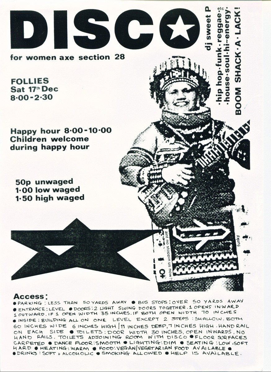 A poster for an anti-Section 28 women's night at Follies with DJ Philippa Jarman, who was sometimes known as 'Sweet P'.