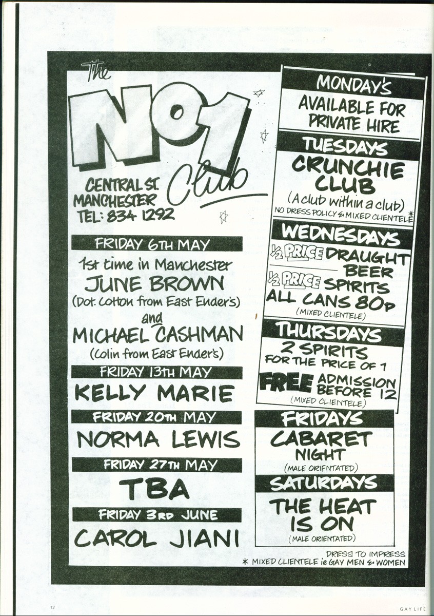 An advert that illustrates what a night at the Number 1 Club would have been like before its highly successful reincarnation as a gay house club in 1991.
