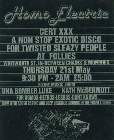 An early Homo Electric flyer from the days when it was on a Thursday night. Follies was a great, intimate venue. The bar was run by ladies who you would not fuck with for one moment. There was a picture of Martina Navratilova on the wall overlooking proceedings like some Slavic Our Lady.