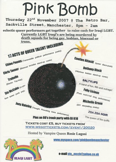 A one-off queer performance and music night organised by Ste McCabe - featured a load of bands and performers who all played for free, some travelling from across the country, to raise money for Iraqi LGBT's being targeted for torture and murder. The night sold out and raised nearly 1000 pounds for Iraqi LGBT. It was WILD.