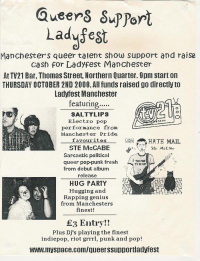One of two fundraising alternative punk/electro events for Ladyfest Manchester, organised and performed by local queer acts. Small and cosy nights which raised a few hundred quid each time.