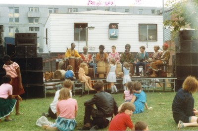 African drumming style, Hulme Carnival, August 83.White Horse pub behind the stage with John Nash Crescent looming in the background.