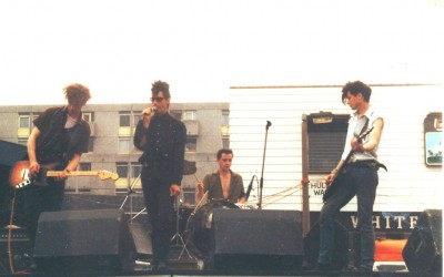 At last, a band! Inca Babies playing in front of The White Horse, Hulme Carnival, Aug 83.