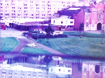 An overview of the Hulme Carnival playground in front of Charles Barry and facing the back of John Nash Cresc. The shops with the best/worst chip shop in the world, The White Hor.. as its named in this photo, and The Zion Building (featured in the film Reds) stand in between. I must have been going through a particularly David Bailey phase cos I took the pic through one of the tilt windows (for ease of cleaning when youre so high up), and was trying to artistically capture the nuances of light and reflection of the panoramic view before me; Id give meself 6 out of 10 for effort ; not so sure about style and content.....