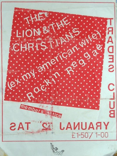 The Lion and The Christian, Moss Side band, on A3. Dont know where, dont know when. Ex My American Wife, Automation, by way of Suns of Arqa, A.C.R. (?), Nine Bar, Naked In Winter and probably numerous others.... Guesstimating 86....