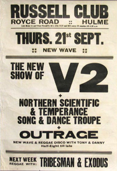 A poster for V2's new show! Who were Tony and Danny the DJ's, does anyone know? The Russell Club was also known as The Factory, where Factory Records put on many gigs. It later became the PSV...
