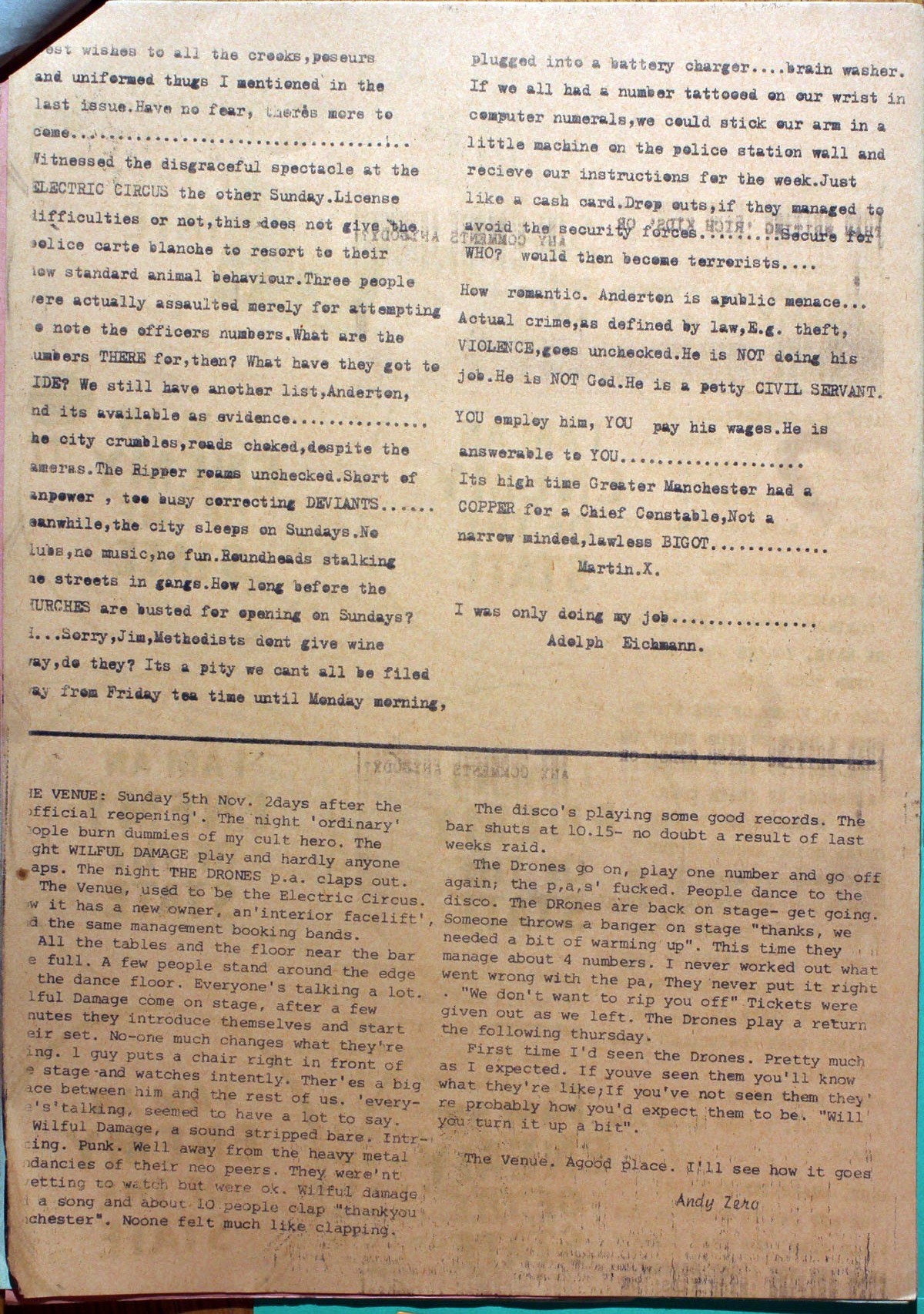THE VENUE: Sunday 5th Nov. 2 days after the ‘official reopening’. The night ‘ordinary’ people burn dummies of my cult hero. The (?)ght WILFUL DAMAGE play and hardly anyone claps. The night THE DRONES p.a. claps out. The Venue, use to be the Electric Circus. Now it has a new owner, an ‘interior facelift’, and the same management booking bands.