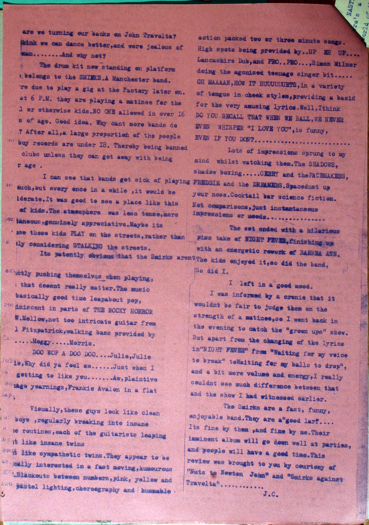 The drum kit now standing on platform (?) belongs to THE SMIRKS. They’re due to play a gig at the Factory later on. (?) at 6 P.M. they are playing a matinee for the (?)l or otherwise kids. NO ONE allowed in over 16 years of age. Good idea. Why can’t more bands do this? After all, a large proportion of the people who buy records are under 18. Thereby being banned from clubs unless they can get away with being (?)r age.