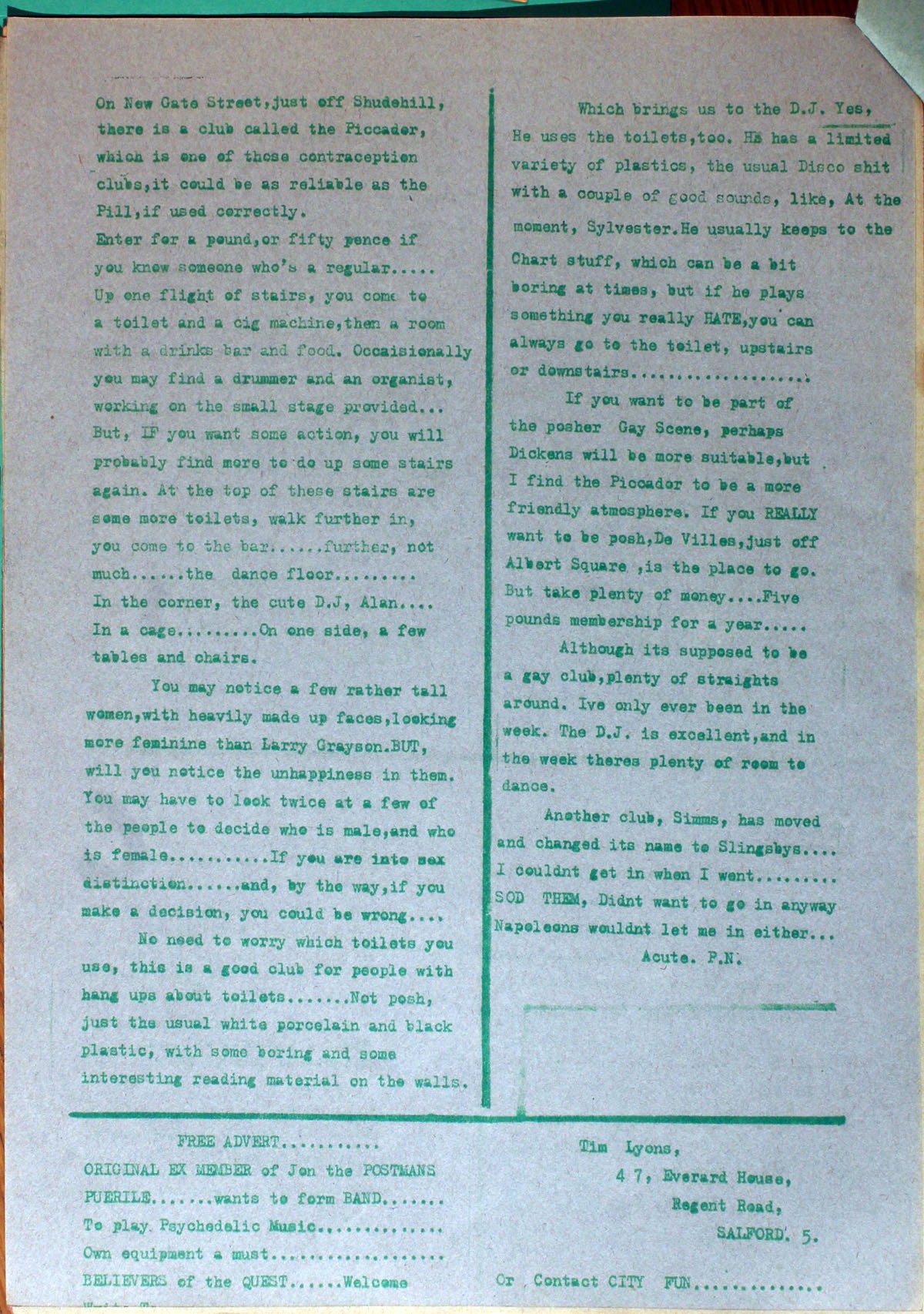 On New Gate Street, just off Shudehill, there is a club called the Piccader, which is one of those contraception clubs,it could be as reliable as the Pill,if used correctly.