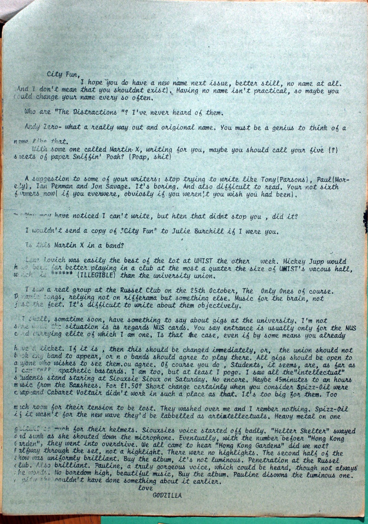 I shall, somatime soon, have something to say about gigs at the university. I’m not sure what the situation is as regards NUS cards. You say entrance is usually only for the NUS card carrying elite of which I am one. Is that the case, even if by some means you already have a ticket. If it is, then this should be changed immediately, or, the union should not book any band to appear, or no bands should agree to play there. All gigs should be open to anyone who wishes to see them. ou agree. Of course you do , Students, it seems, are, as far as I can tell apathetic bastards. I am too, but at least I pogo. I saw all the”intellectual” students staring at Siouxsie Sioux on Saturday. No encore. Maybe 45minutes to an hours music from the Banshees. For £1.50? Short change certainly when you consider Spizz-Oil were crap and Cabaret Voltair didn’t work in such a place as that. It’s too big for them. Too much room for their tension to be lost. They washed over me and I rember nothing. Spizz-Oil if it wasn’t for the new wave they’d be labbelled as antintellectuals. Heavy metal on one guitar as much for their helmets. Siouxsie’s voice started off badly. “Helter Skelter” swayed and sunk as she shouted down the microphone. Eventually, with the number befoer “Hong Kong Garden”, they went into overdrive. We all came to hear “Hong Kong Gardens” did we not? Halfway through the set, not a highlight. There were no highlights. The second half of the show was uniformly brilliant. Buy the album, it’s not luminous. Penetration at the Russel Club. Also brilliant. Pauline, a truly gorgeous voice, which could be heard, thought not always the words. No boredom high, beautiful music. Buy the album. Pauline disowns the luminous one. A pity she couldn’t have done something about it earlier.