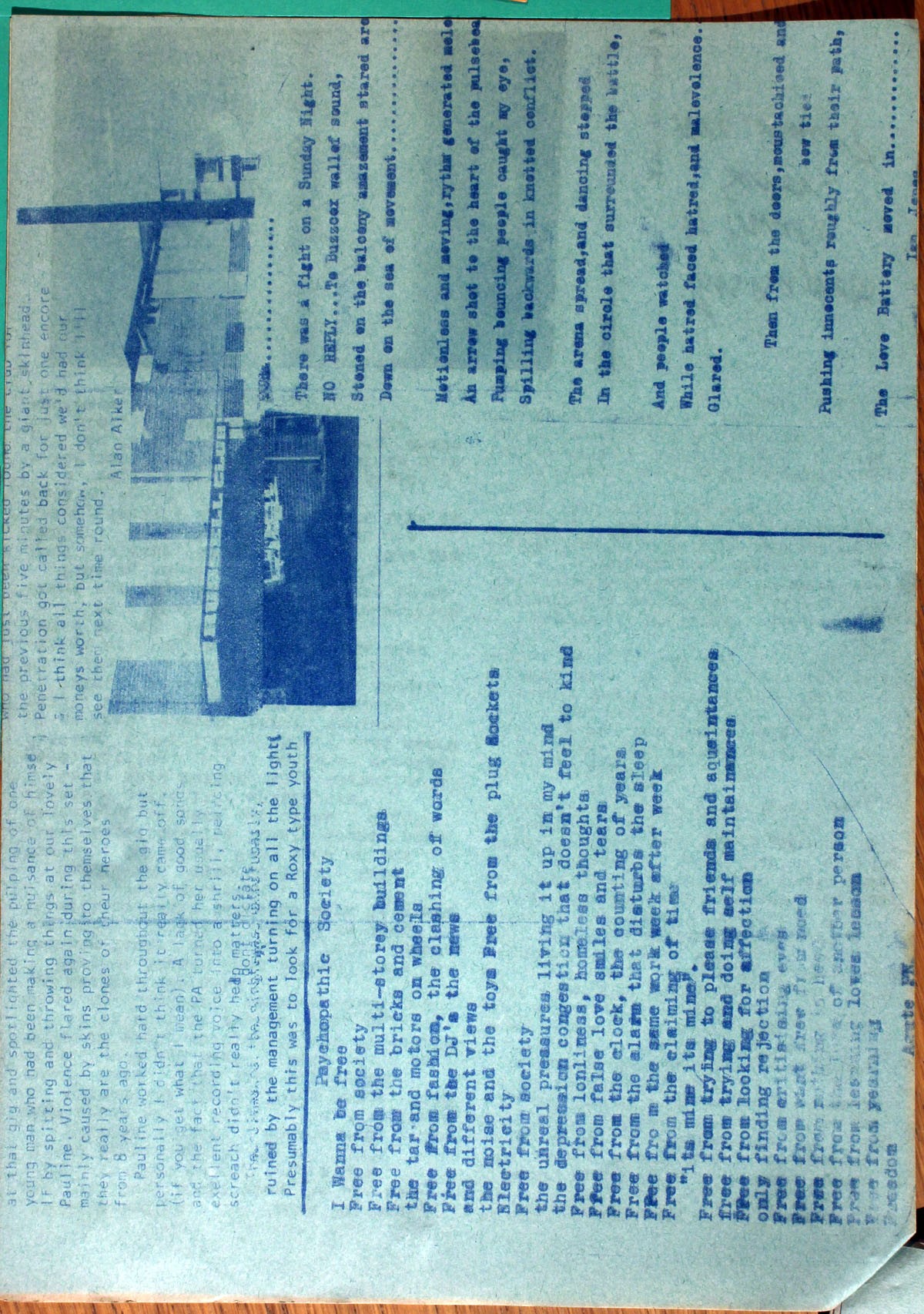 at that gig and spotlighted the pulping of one young man who had been making a nuisance of himself by spitting and throwing things at our lovely Pauline. Violence flared again during this set – mainly caused by skins proving to themselves that they really are the clones of theur heroes from 8 years ago.