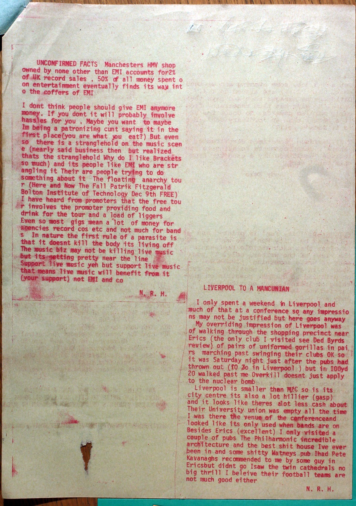 I dont think people should give EMI anymore money. If you dont it will probably involve hassles for you. Maybe you want to maybe Im being a patronizing cunt saying it in the first place(you are what you eat?) But even so there is a stranglehold on the music scene (nearly said business then but realized thats the stranglehold Why do I like Brackets so much?) and its people like EMI who are strangling it Their are people trying to do something about it The floating anarchy tour (Here and Now The Fall Patrik Fitzgerald Bolton Institute of Technology Dec 9th FREE) I have heard from promoters that the free tour involves the promoter providing food and drink for the tour and a load of liggers Even so most gigs mean a lot of money for agencies record cos etc and not much for bands In nature the first rule of a parasite is that it doesnt kill the body its living off The music biz may not be killing live music but its getting pretty near the line Support live music yeh but support live music that means live music will benefit from it (your support) not EMI and co