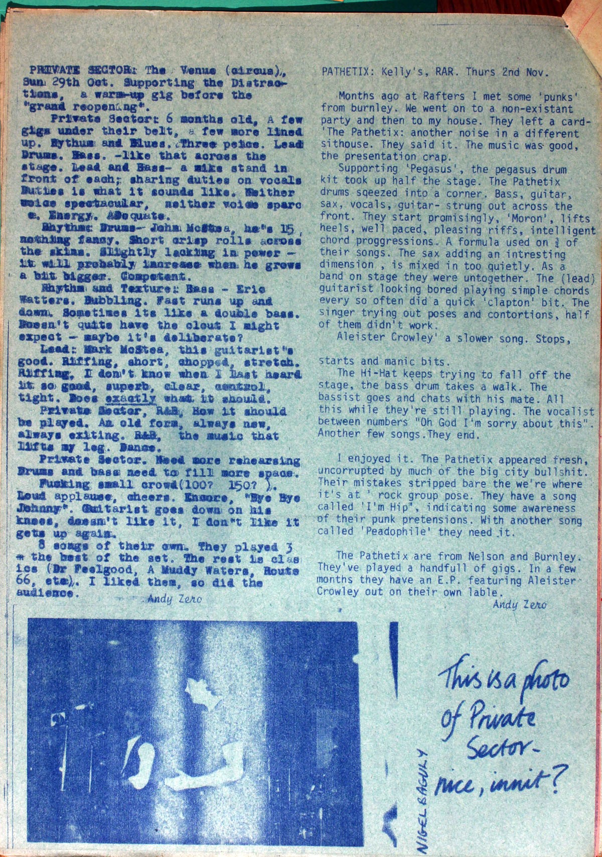 Months ago at Rafters I met some 'punks' from burnley. We went on to a non-existant party and then on to my house. They left a card- 'The Pathetix: another noise in a different sithouse. They said it. The music was good, the presentation crap.