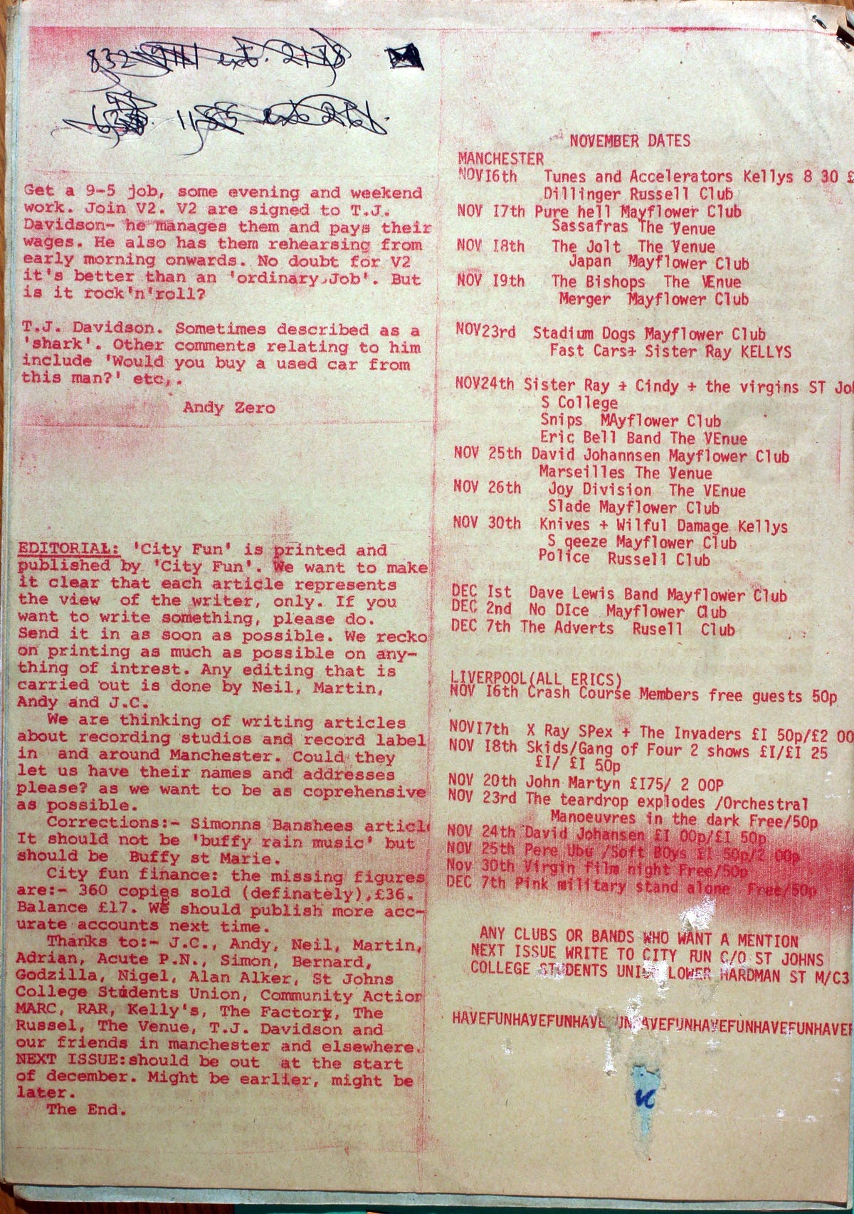 EDITORIAL: 'City Fun' is printed and published by 'City Fun'. We want to make it clear that each article represents the view of the writer, only. If you want to write something, please do. Send it in as soon as possible. We reckon on printing as much as possible on anything of interest. Any editing that is carried out is done by Neil, Martin, Andy and J.C.