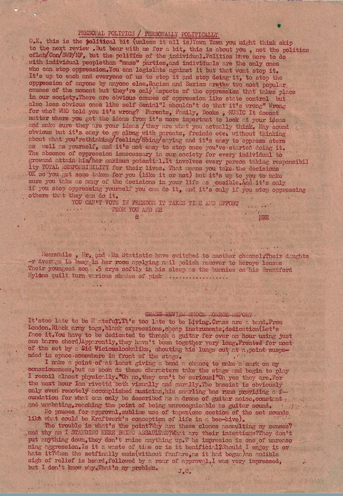 O.K. this is the political bit (unless it all is)Yawn Yawn you might think skip to the next review .But bear with me for a bit, this is about you , not the politics ofLab/Con/SWP/NF, but the politics of the individual.Politics have more to do with individual peoplethan “mass” parties,and individuals are the only ones who can stop oppression.You can legislate against it but that won’t stop it. It’s up to each and every one of us to stop it and stop doing it, to stop the oppression of anyone by anyone else.Racism and Sexism arethe two most popular causes of the moment but they’re only aspects of the oppression that takes place in our society.There are obvious causes of oppression like state control but also less obvious ones like self denial”I shouldn’t do that it’s wrong” Wrong for who? WHO told you it’s wrong? Parents, Family, Books, MUSIC It doesnt matter where you got the ideas from it’s more important to look at your ideas and make sure they are your ideas / they are what you actually think. May sound obvious but it’s easy to go along with parents, freinds etc. without thinking about whatyou’re thinking/feeling/doing/saying and it’s easy to oppress oters as well as yourself, and it’s not easy to stop once you’ve started doing it. The absence of oppression isnecessary in our society for every individual to growand attain his/her maximum potential. It involves every person taking responsibility TOTAL RESPONSIBILITY for their lives. That means you take the decisions OK so you get some taken for you (like it or not) but it’s up to you to make sure you take as many of the decisions in your life as possible.And it’s only if you stop oppressing yourself you can do it, and it’s only if you stop oppressing others that they can do it.